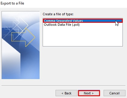 1. In the next dialog window, choose Comma Separated Value (CSV). Hit Next.