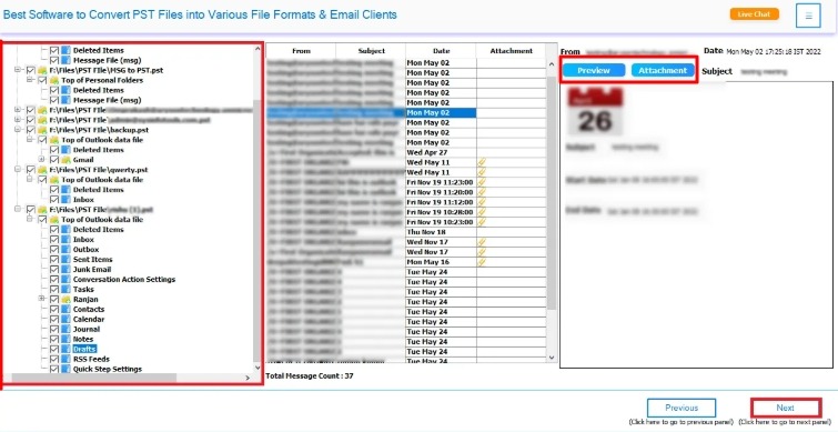 3. Select PST folders from the tree hierarchy in the preview panel. Tap Next.