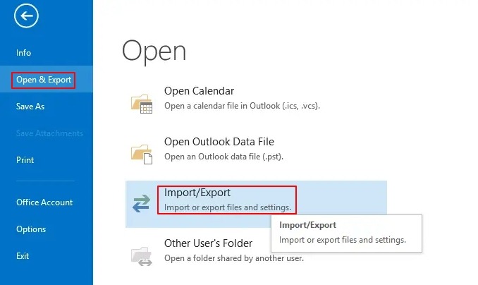2. Tap Open & Export in the left pane and select feature: Import/Export.